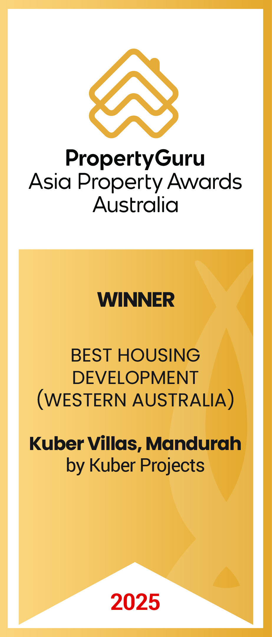 Kuber Villas™ Golden Bay and Kuber Villas™ Mandurah have won best investment housing development, and best housing development (Western Australia) at the 8th Asia Property Awards Australia, 2025, recognised among the nation’s leading developments.